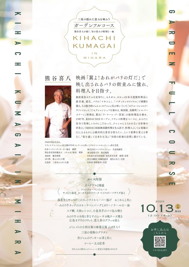 日本を代表する料理人で三原市ふるさと大使の『熊谷喜八』シェフが三原市の食材を使ったランチフルコースを提供します。