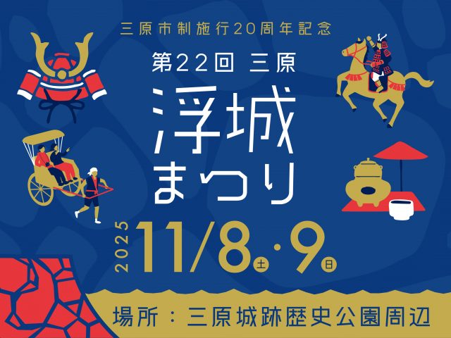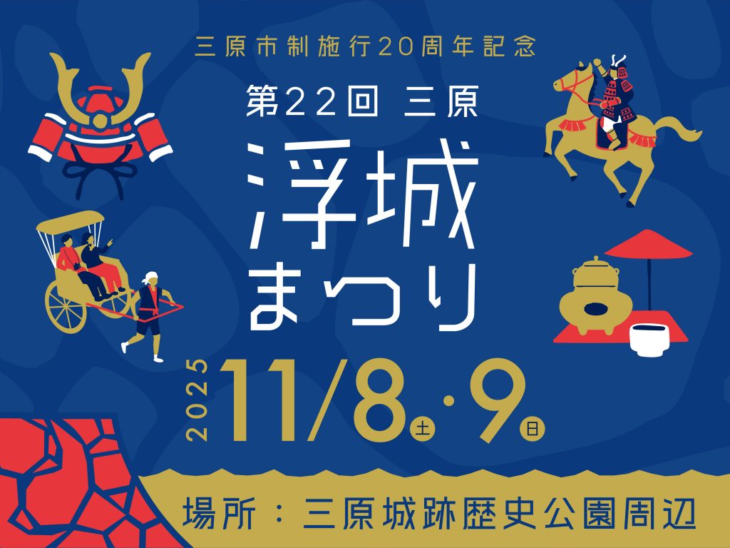 ニュース2025年9月21日 第22回三原浮城まつり 開催決定! 【第22回 三原浮城まつり】開催決定! ◉開催日時 11/8(土)・9(日) ◉開催場所 三原城跡歴史公園・周辺エリア 歴史、体験、グルメ、ライトアップ等々 三原の魅力をぎゅっと詰め込んだ2日間となっています。 これから徐々に イベント当日の企画や見どころを発信していきます。 どうぞ皆様、お楽しみにお待ちください。 拡大 新着のニュース 2025年11月14日 三原市長記者会見だるまのご紹介【11月】 2025年11月12日 ファンライドみはらin中央森林公園2025開催のお知らせ 2025年11月09日 浮城まつり チャンバラ合戦の開催について 2025年11月03日 第27回みはら市民音楽祭 開催のお知らせ 2025年11月02日 『11月城下町三原てくてくガイド』開催のお知らせ