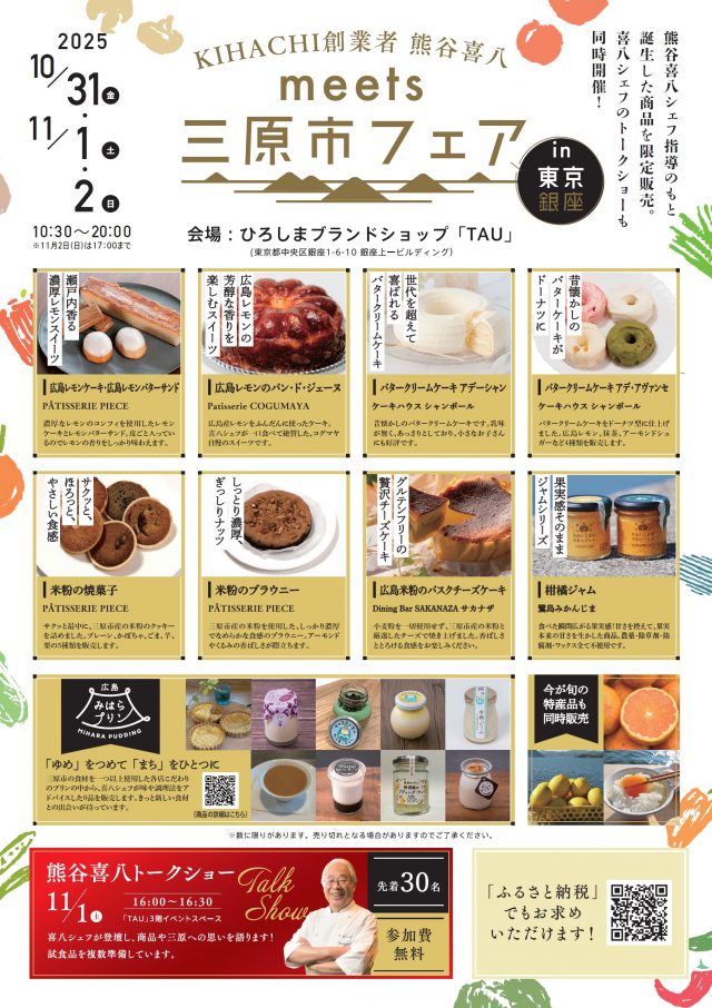 また、商品を試食しながら、喜八氏の三原や商品への思いが直接聞ける、トークショーも開催します。